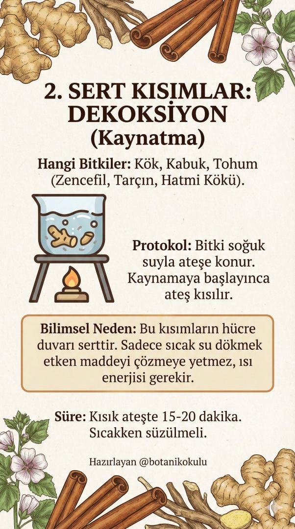 Zencefil, tarçın, ekinezya kökü gibi odunsu kısımlar, etken maddelerini sert selüloz yapıların içinde saklar. Sadece sıcak su dökmek bu duvarları yıkmaya yetmez; ısı enerjisi ve aktif kaynama gerekir.