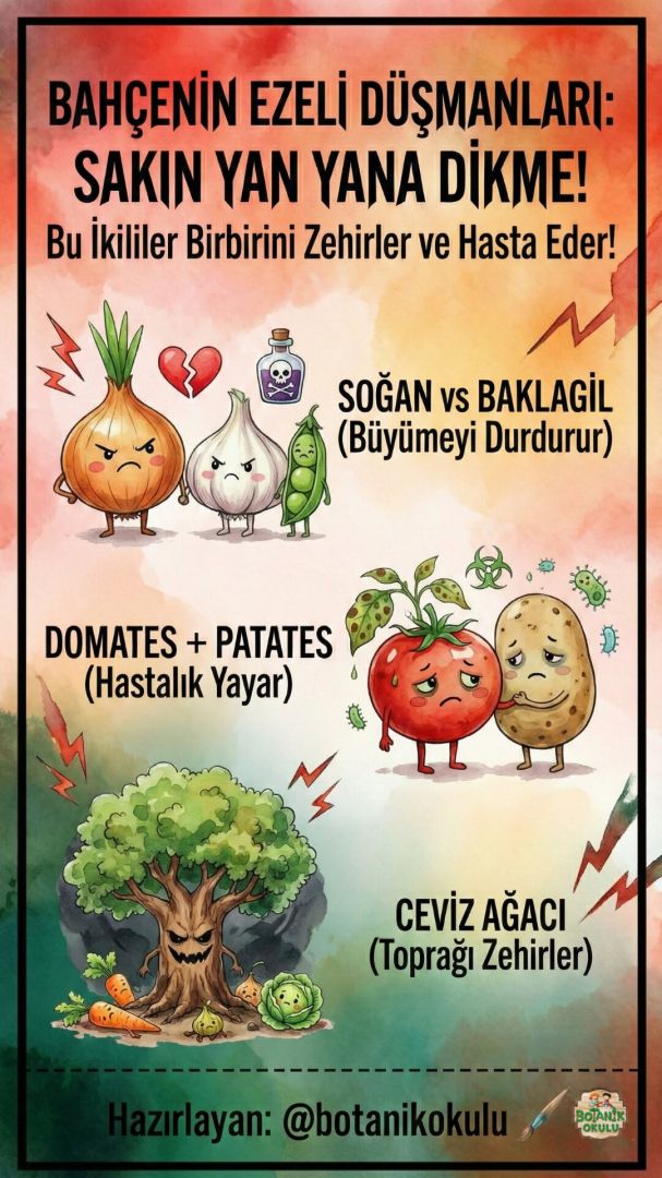❌ Allelopatinin Kralı: Ceviz Ağacı (Juglon Etkisi) Düşman bitki kavramının en net örneği Kara Ceviz (Juglans nigra) ağacıdır. Ağaç; kökleri, yaprakları ve meyve kabuklarından "Juglon" adı verilen toksik bir madde salgılar. Bu madde, özellikle domates, patates, biber gibi Solanaceae ailesi üyeleri için ölümcüldür. Ceviz ağacının gölgeleme alanının altında sebze bahçesi kurmak neredeyse imkansızdır.