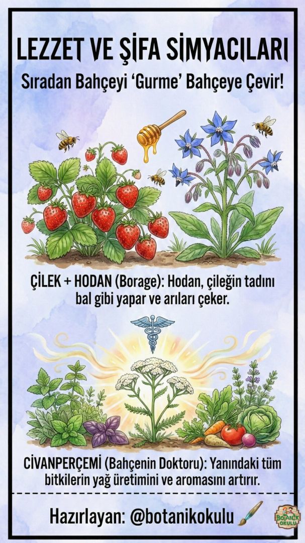 ✅ İleri Seviye Simbiyoz: Çilek ve Hodan (Borage) Hodan bitkisi, arıları mıknatıs gibi çeken mavi çiçeklere sahiptir ve bu sayede çileklerin tozlaşma oranını artırır. Ayrıca kök yapısıyla topraktaki iz elementleri yüzeye taşıyarak çileğin tadını iyileştirdiği bilinmektedir.